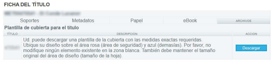 Para subir la cubierta de un título puede usar la plantilla que Bibliomanager pone a su disposición a través del área de Mis títulos / Administración de títulos / Título / Archivos, tal y como puede ver en la siguiente imagen.