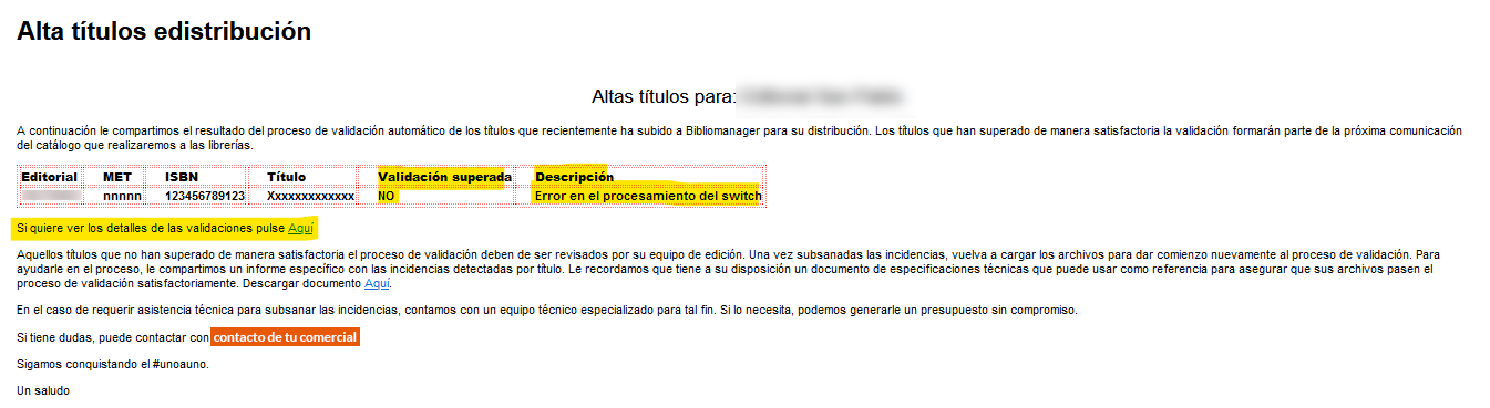 Una vez se ha realizado la subida de las publicaciones en la plataforma, a continuación estos archivos pasarían al proceso automático de validación. Una vez el sistema ha ejecutado esta validación de los archivos el editor recibirá un correo electrónico parecido al que mostramos a continuación.